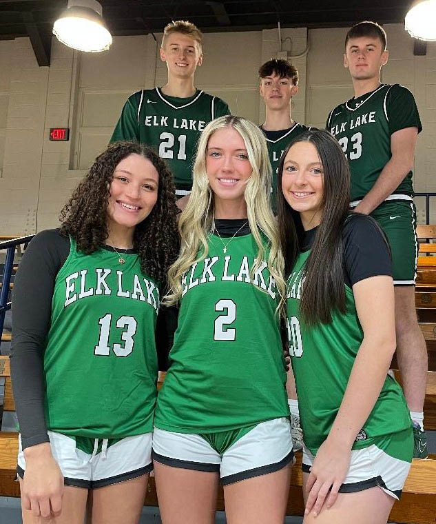 Elk Lake players at Sunday's Coaches vs. Cancer Media Day were, front row, from left: Celeste Clark, Madisyn Casselbury and Kylie Shingler. Back row, same order: John Heitsman, Chase Pond and Brayden Miller. (Tom Robinson Photo)