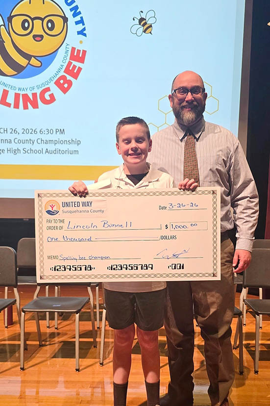 The champion of the first (annual?) Susquehanna County Spelling Bee is Lincoln Bunnell of Montrose, a student in Mrs. Capwell’s homeroom class at Lathrop Street Elementary School. The word he spelled correctly to win the victory was “emptiness.”