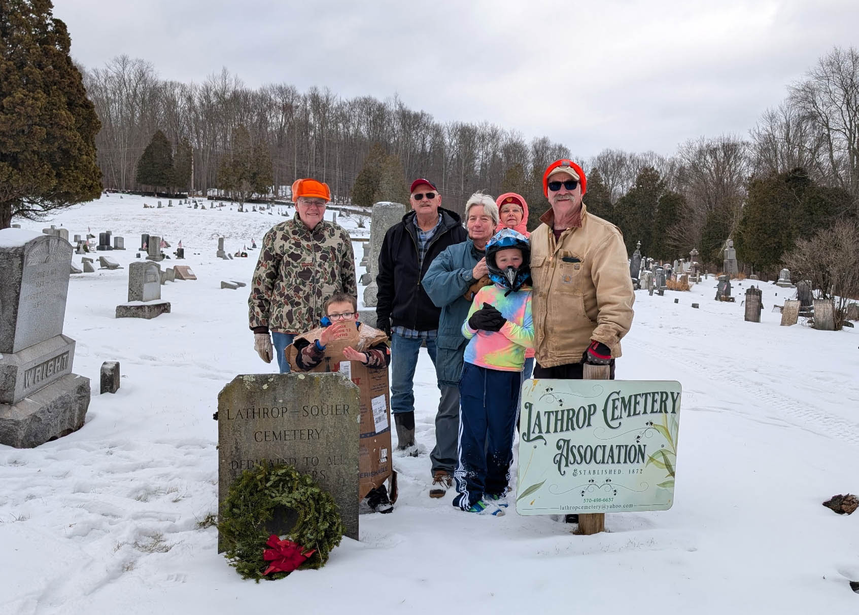 Association members and friends of the Lathrop Cemetery Association conducted the annual Wreaths Across America placement on Veterans graves at the Squiers Cemetery on December 13, 2025. Ninety-eight Veteran's graves, including one who was killed in action during World War I, were decorated with these wreaths on a snowy winter day.