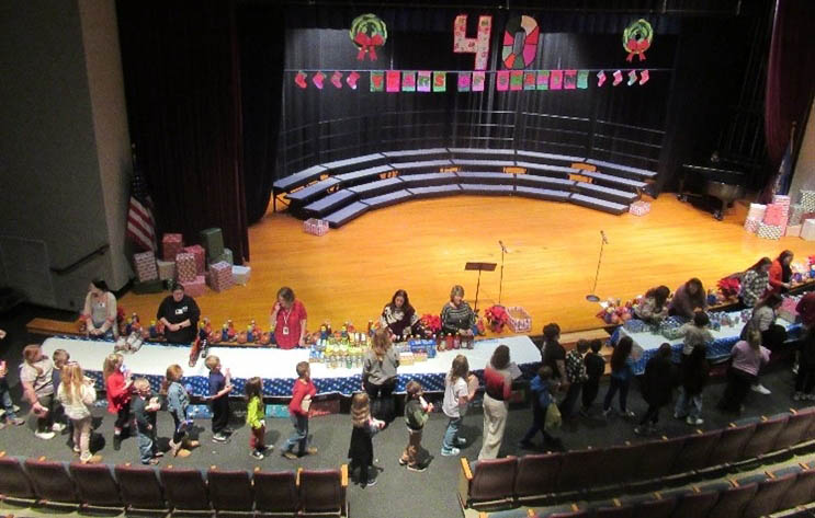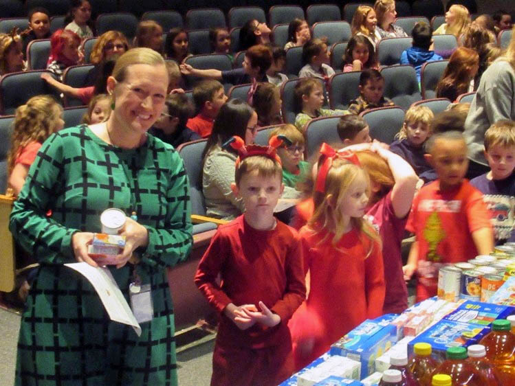 Hanging over the stage at Blue Ridge Elementary School reads, "40 Years of Sharing" as students parade into the auditorium proudly delivering their donations