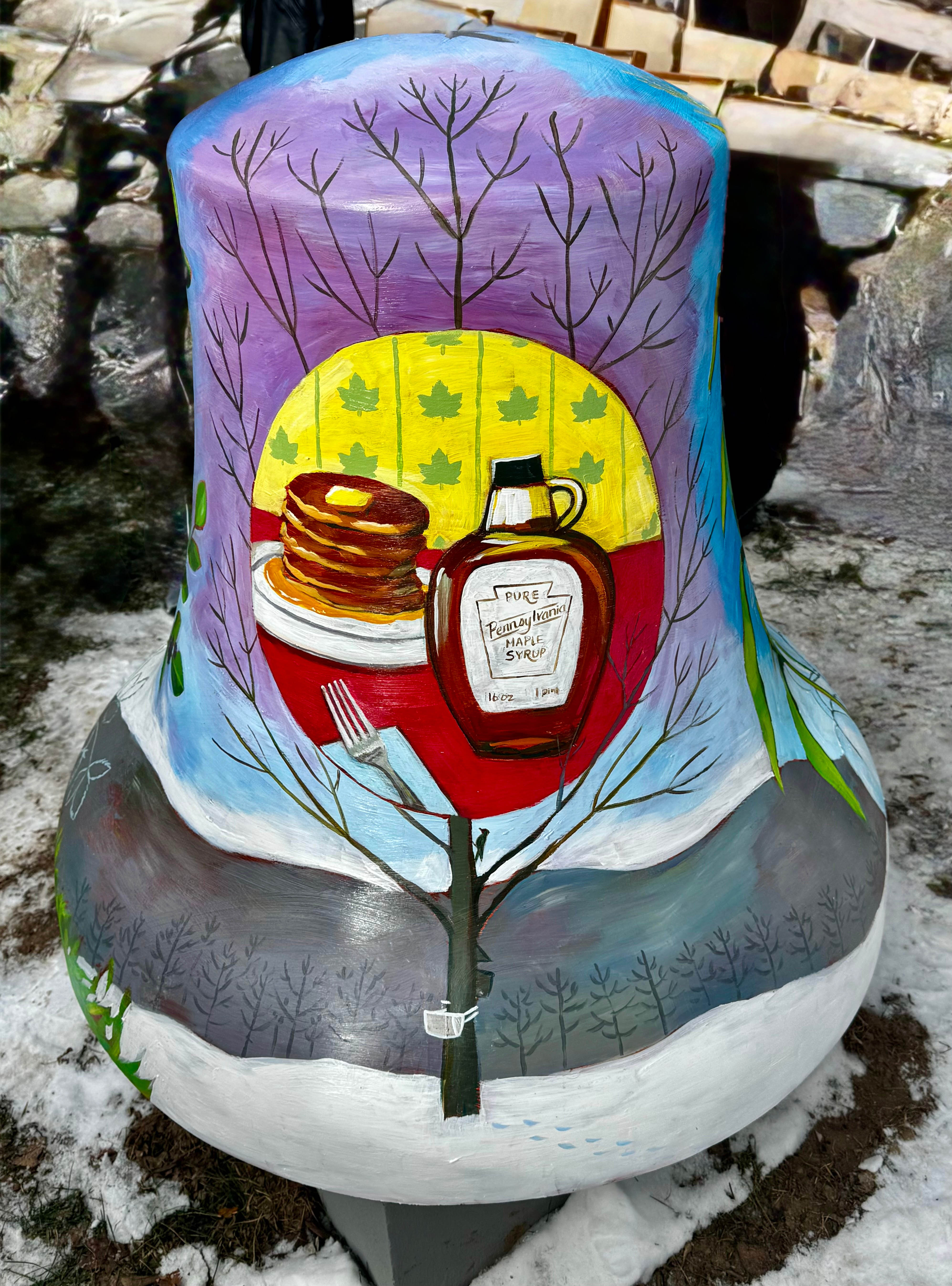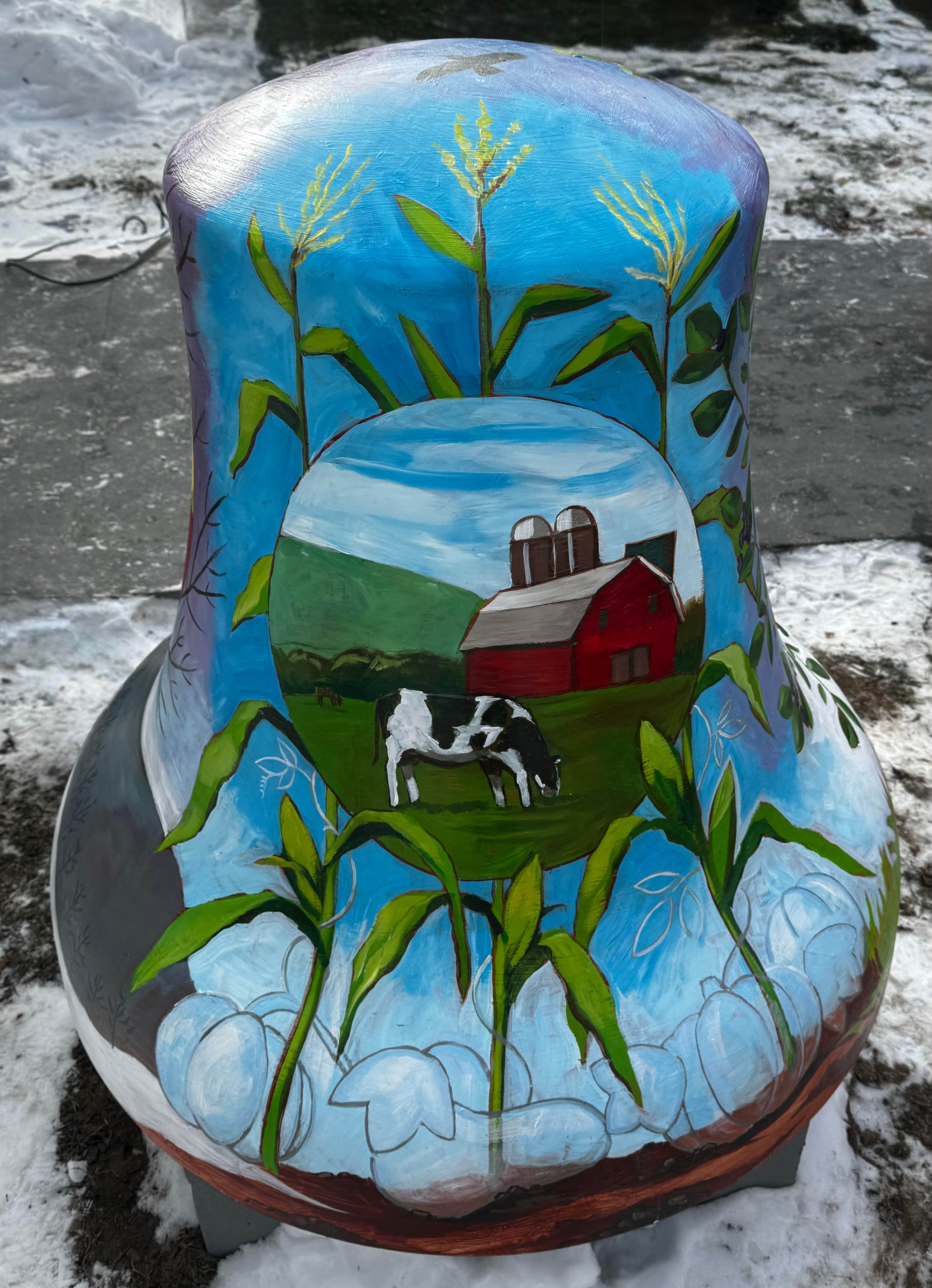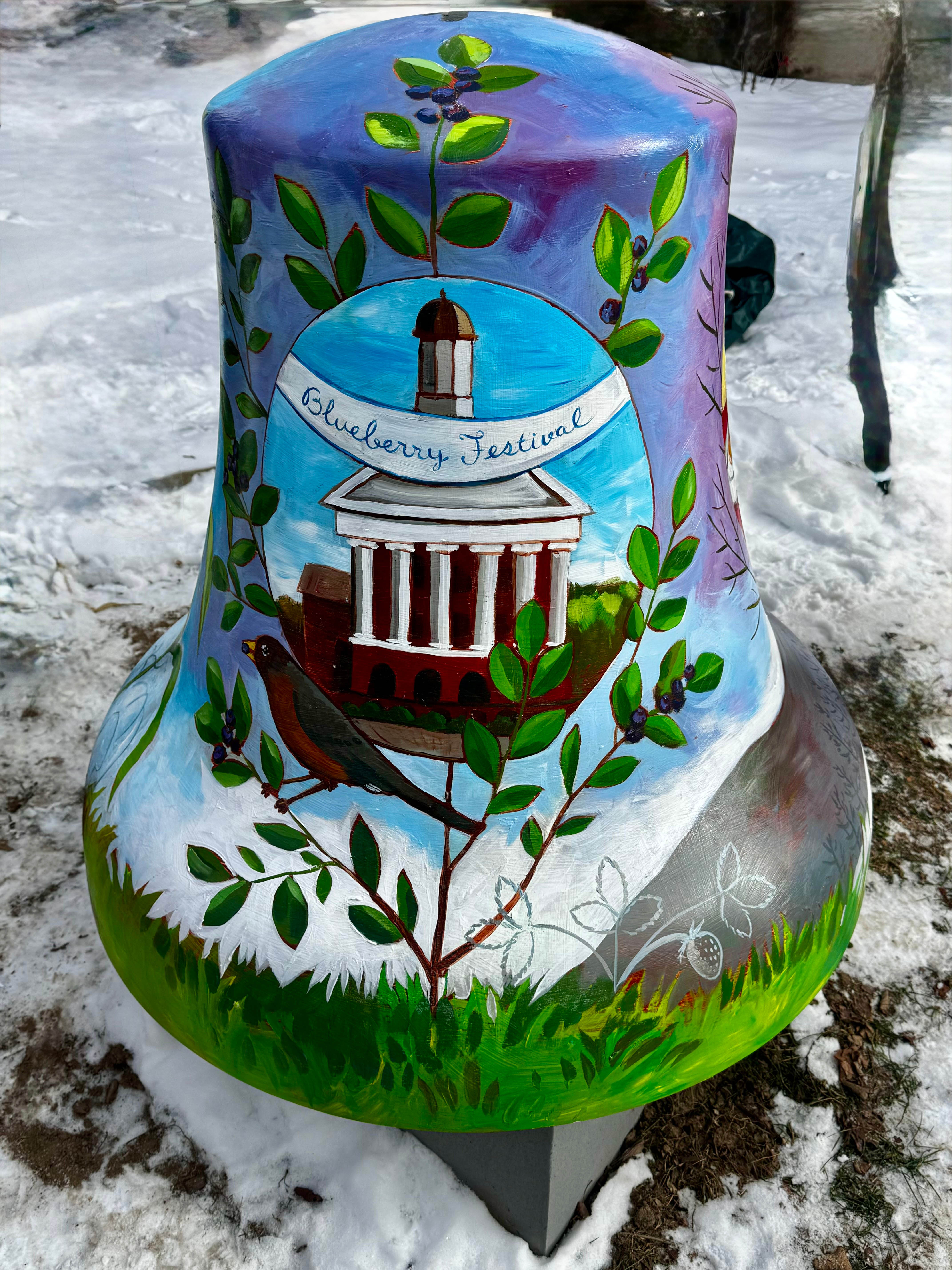 Kelly Finan, the artist of the painting of the fiberglass bell stated this is an invitation to see Susquehanna through her eyes as an artist with a background of plant biology and a fashion for native plants. Ms. Finan relayed how the American plants grew and supported the people and wildlife of this region long before European colonization. She said even today they not only feed us they provide food and shelter for the pollinating animals and other plants that are domestic food supply rely on making them critical for United States food independence. She chose three plants that best represented Susquehanna County, the Sugar Maple, corn and blueberry. Sugar Maple is one of the most abundant trees in Susquehanna County which is a source of sap for maple producers. Iroquois and Anishinaabe people invented maple syrup long before the current tree tapping equipment. Rich in dairy farming, corn and corn meal are chief components of cattle rations providing the starch necessary to fuel milk production. Grown in companionship with squash and beans, maize also known as corn is the tallest member of the three sisters, a technique used by many. Blueberries which grow wild beneath the oak forest farms and on berry farms provide human and wildlife nutrition but are also the star of Susquehanna's annual Blueberry Festival.