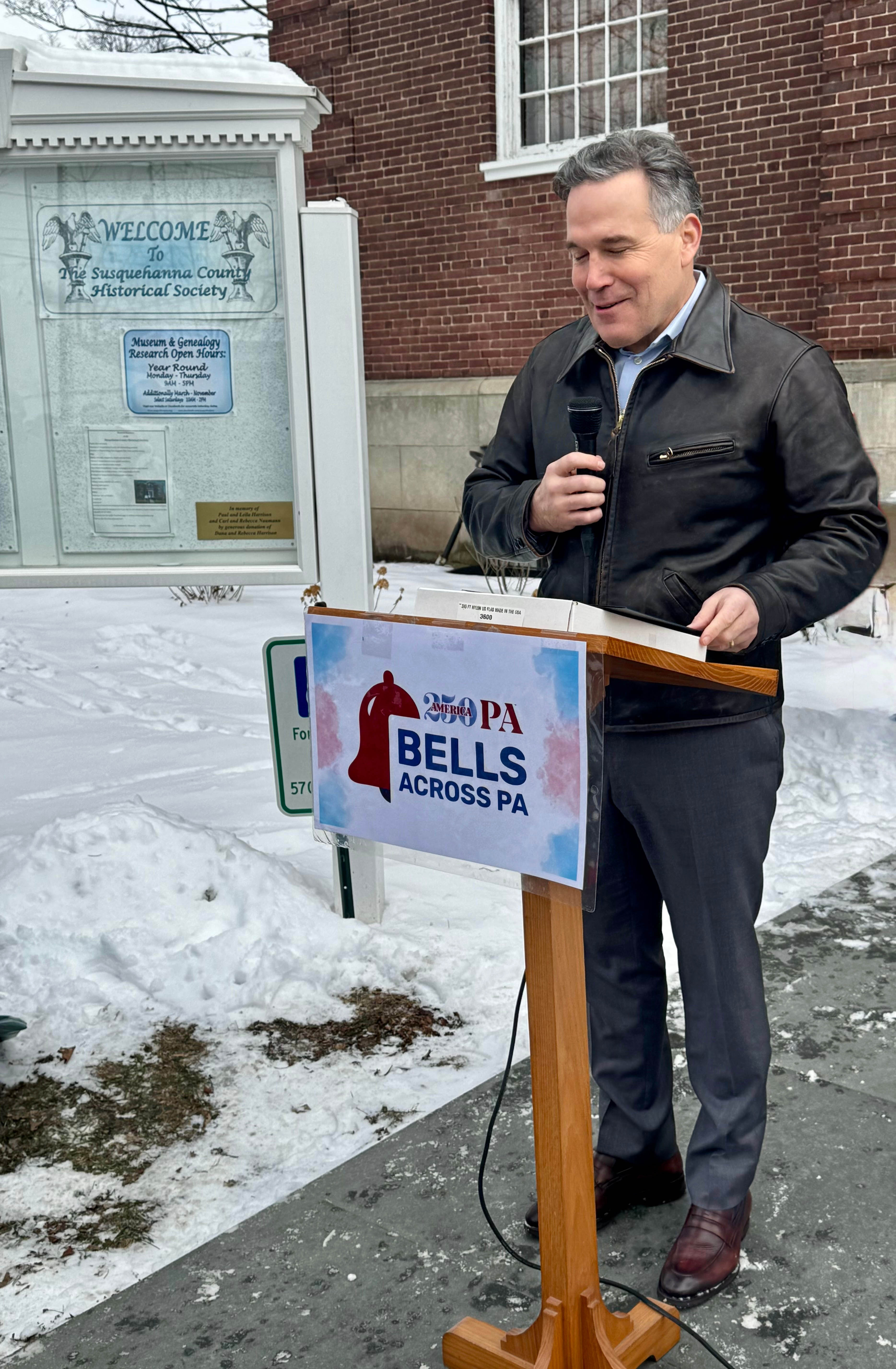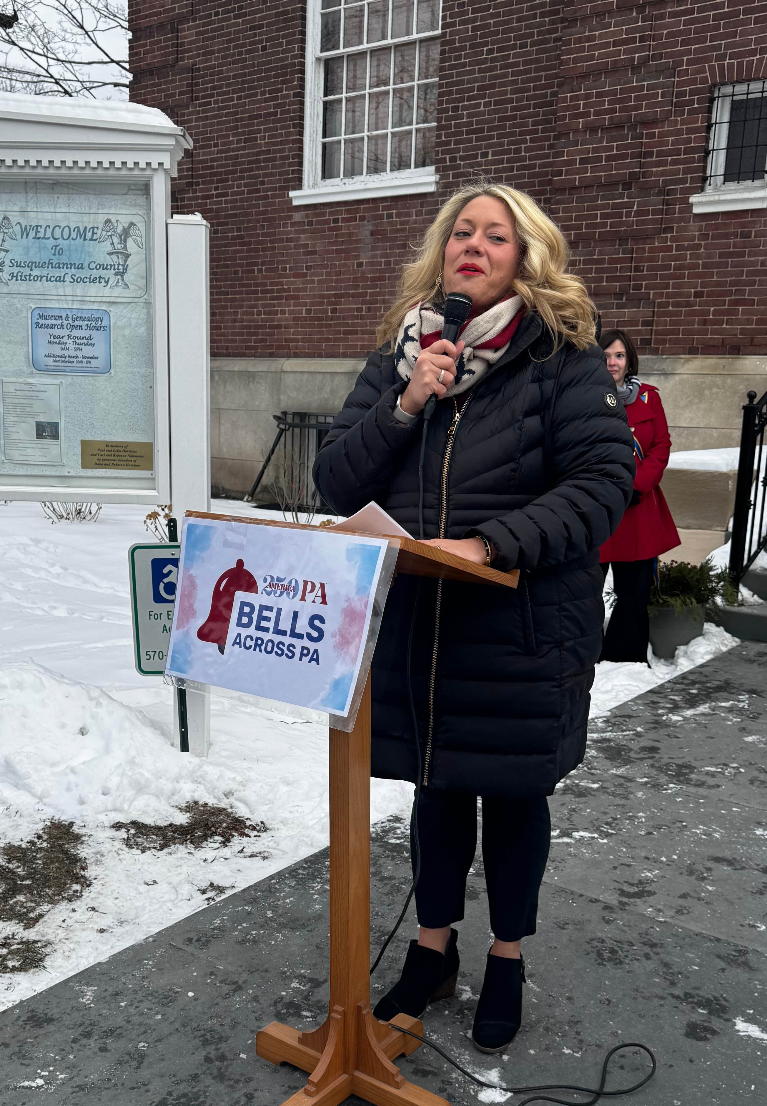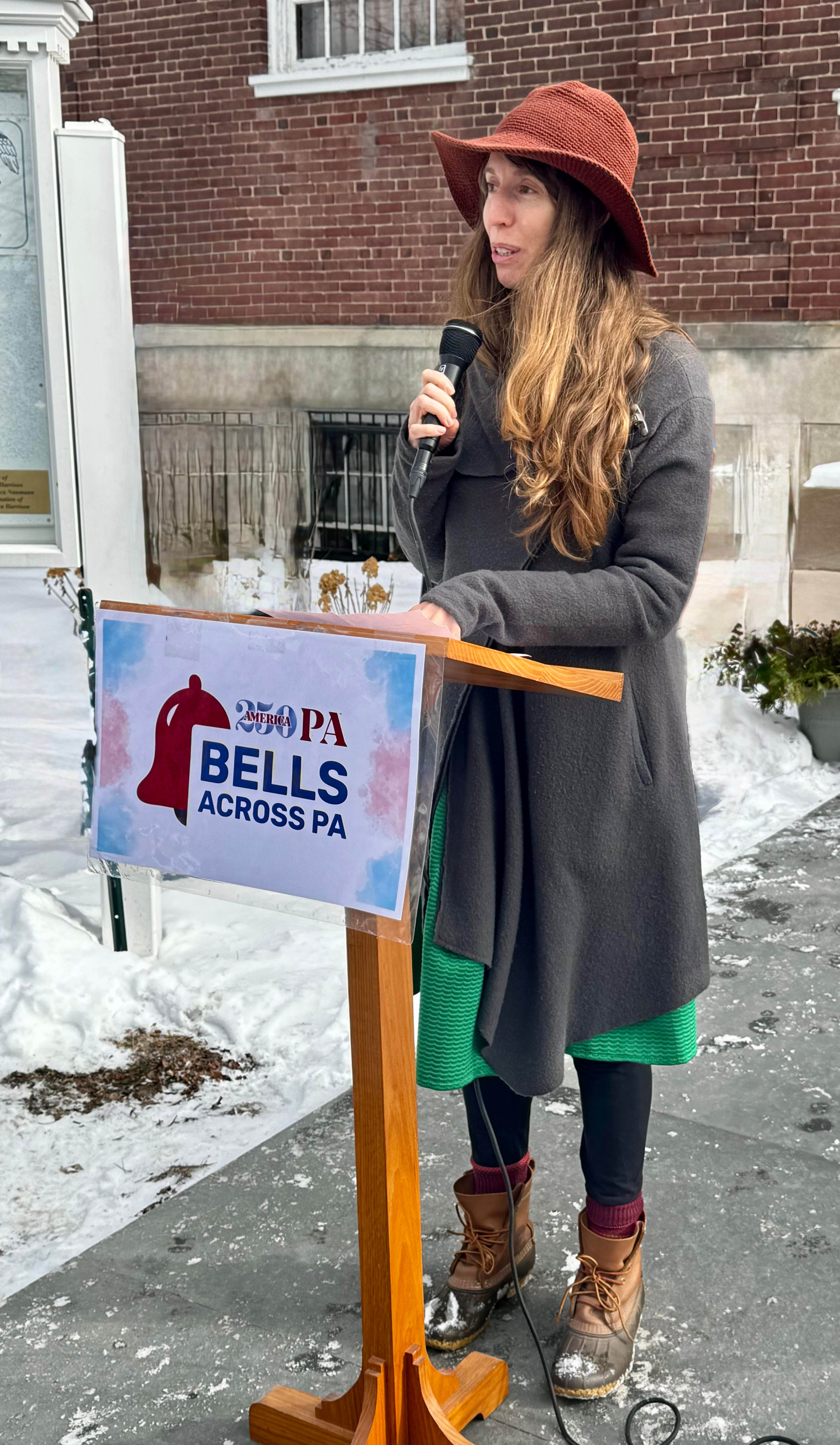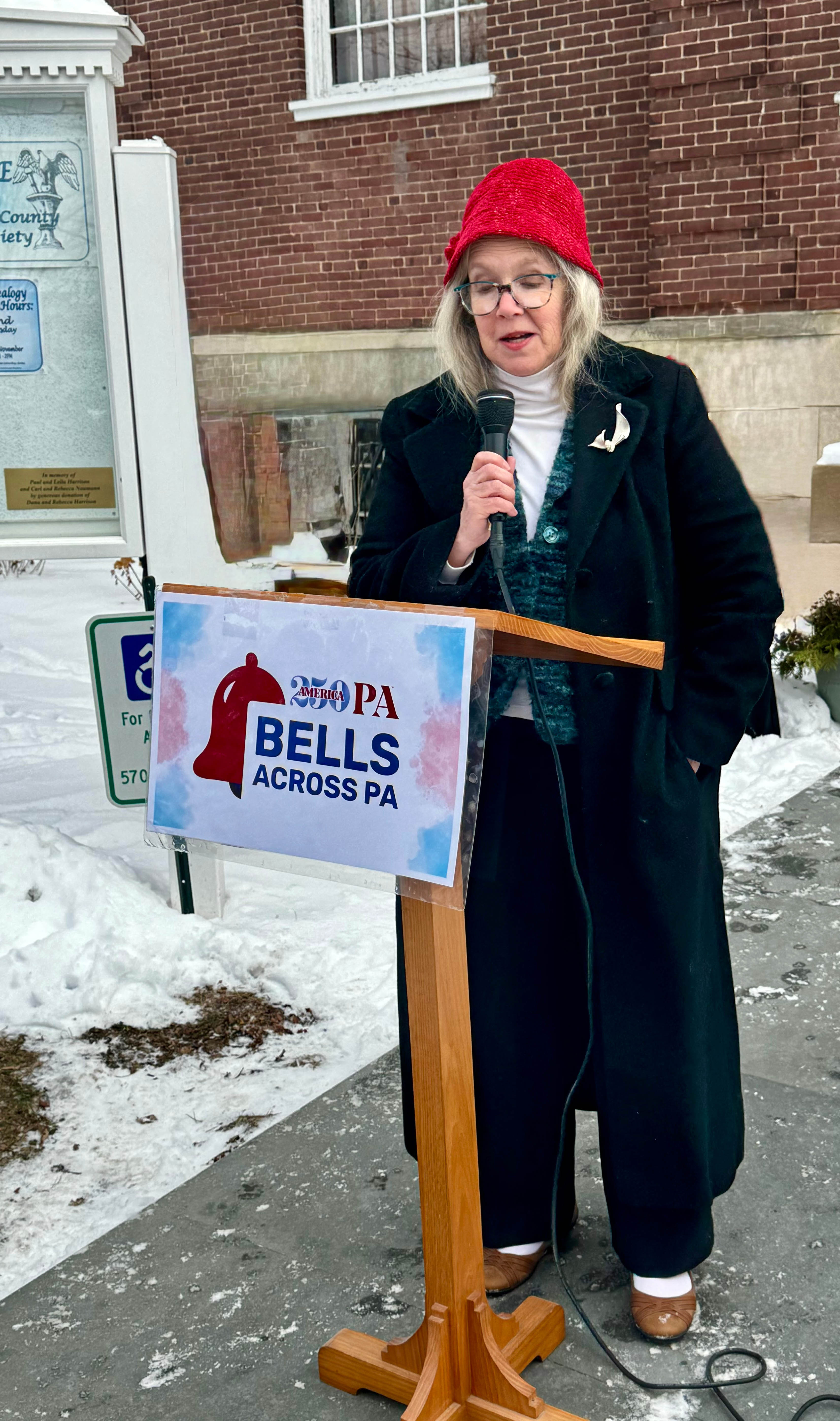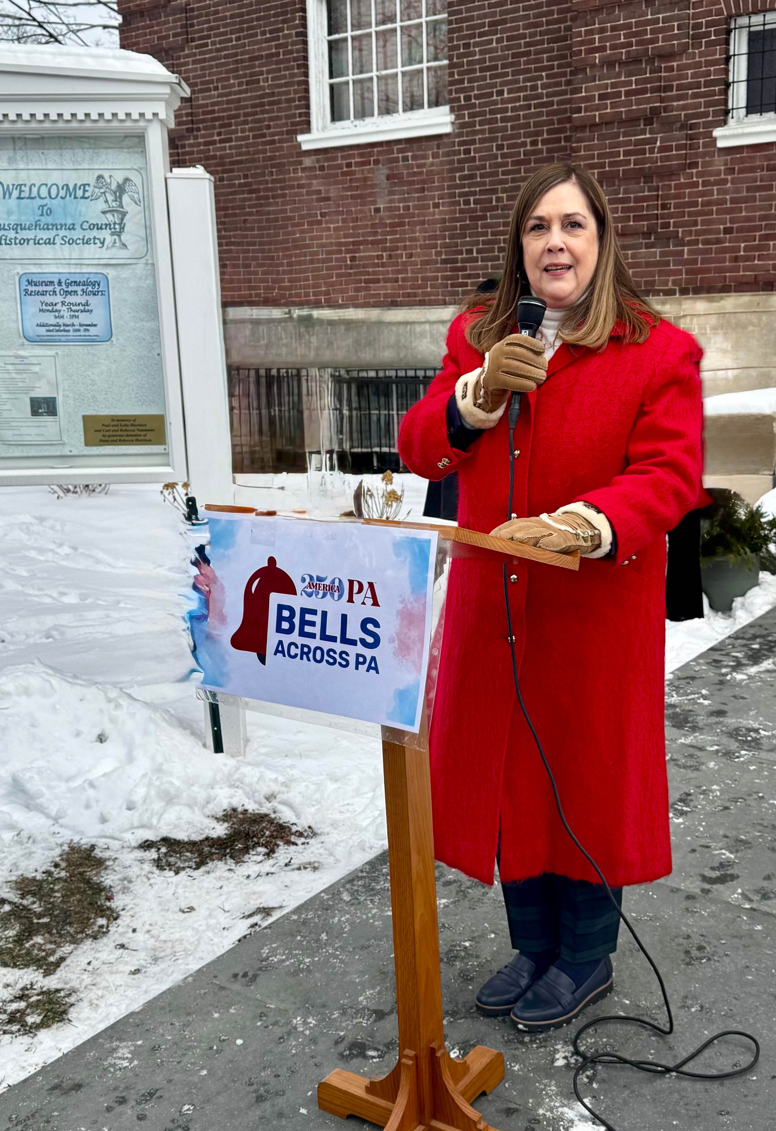 It was a frigid day December 5, 2025 to unveil the Susquehanna Bell in conjunction with America250PA Bells Across PA but it didn't stop people from coming to the event. Cassandra Coleman the Executive Director of America250PA hosted the event. Ms. Coleman thanked Coterra Energy and Pennsylvania American Water Company for their contribution. Bells Across PA is a statewide project by America250PA to place custom-designed bells in all 67 counties by 2026 in preparation of our country's 250th anniversary. Each bell tells a story of its county's history, people and pride. Ms. Coleman recognized the many dignitaries who were in attendance; Senator Dave McCormick, Senator Lisa Baker, Alexandra Allen for House Representative Jonathan Fritz, Mike Marabell for Congressman Dan Meuser, Susquehanna County Commissioners Dave Darrow and Robert McNamara and Dave Palmer the liaison to the bells.