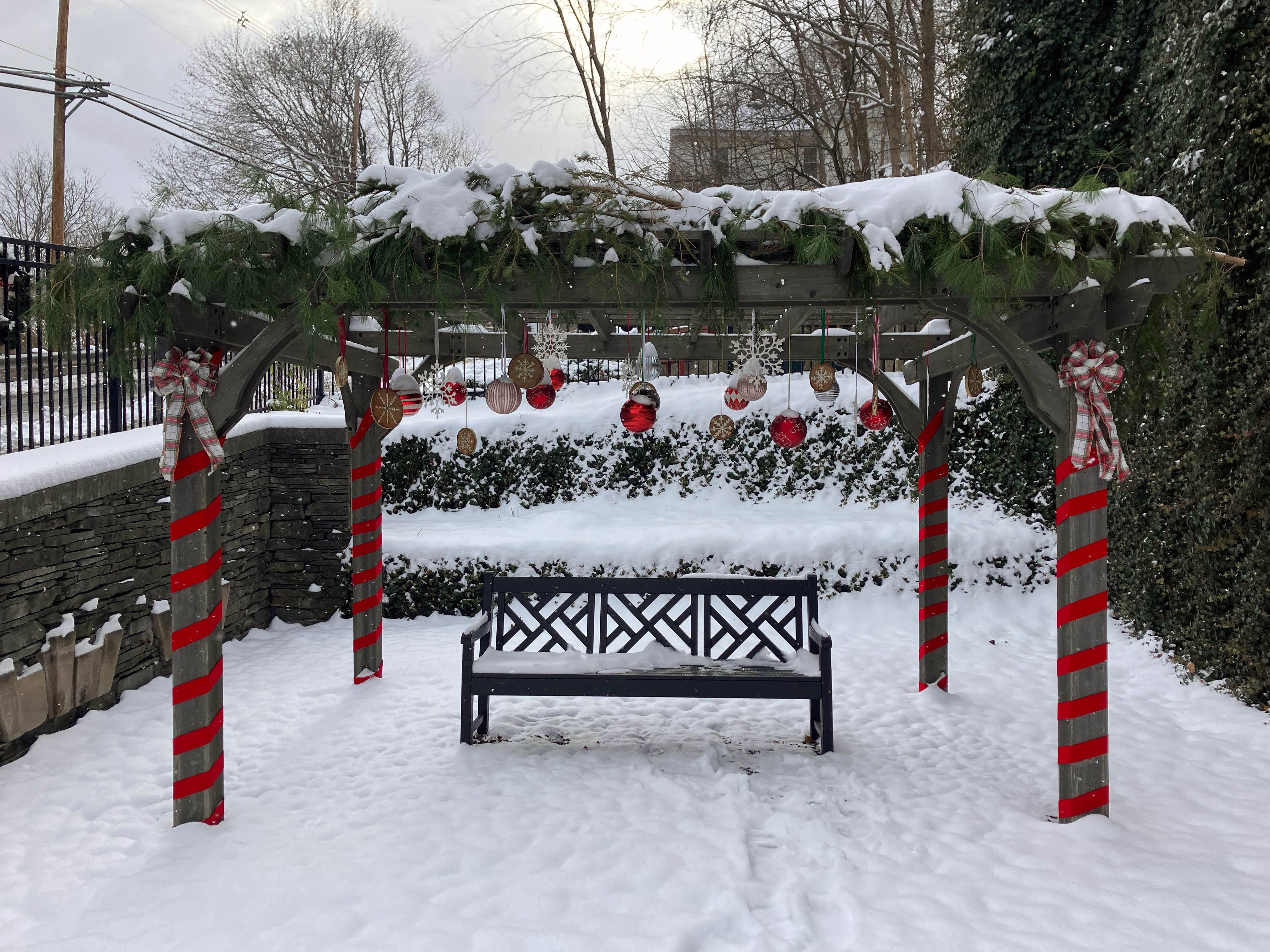 In the Franklin Avenue pocket park, a pergola has been transformed into a winter showplace that sports an evergreen rooftop from which Christmas bulbs descend. A park bench is strategically placed inside the pergola, beckoning the weary, perhaps even the driver noted above. The decorated pergola is a perfect place for families to take Christmas card photos.