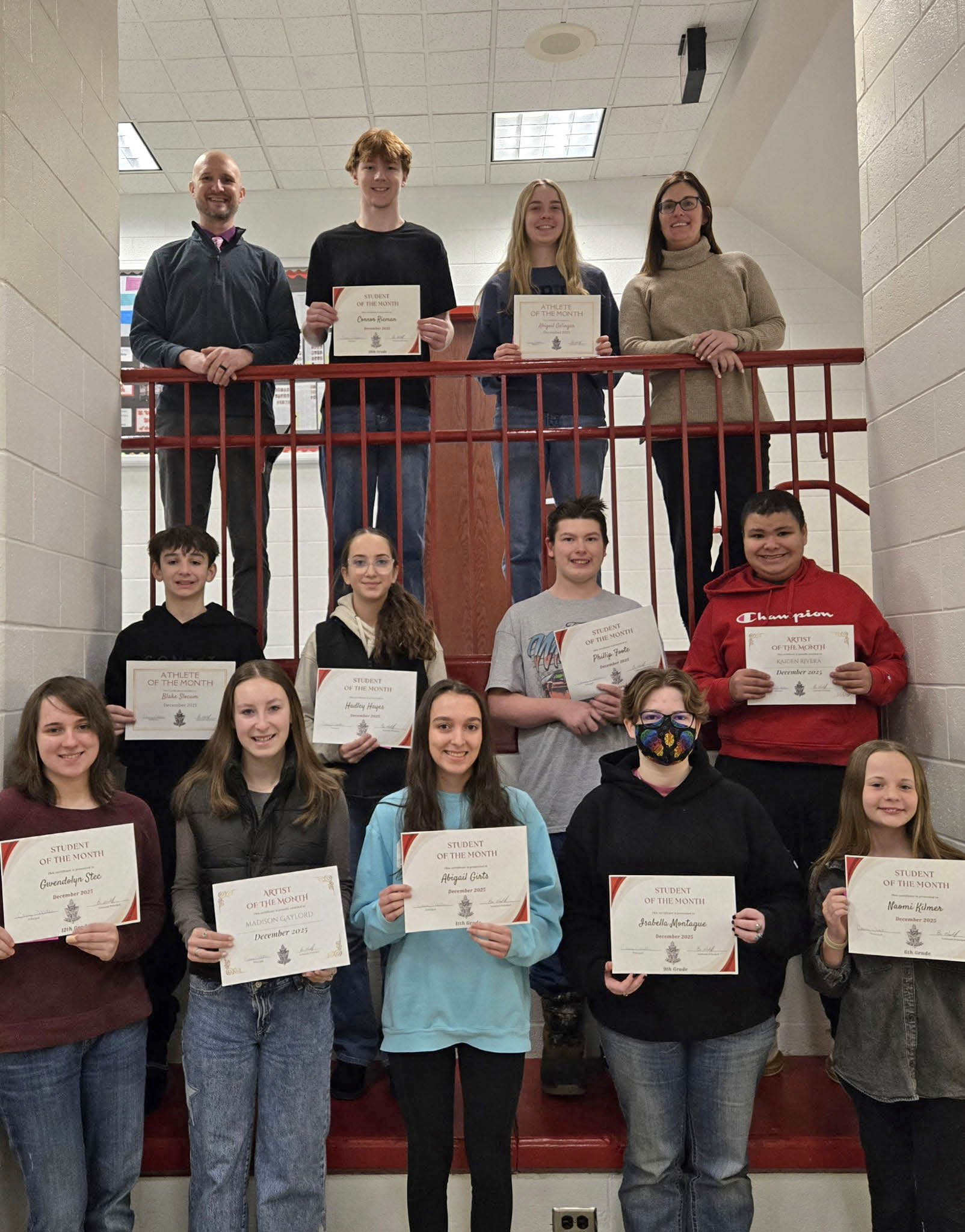 Pictured above (l-r) are Blue Ridge High School December, 2025 Students of the Month: first row - Grade 12 Gwendolyn Stec, HS Artist (Art) Madison Gaylord, Grade 11 Abigail Girts, Grade 9 Isabella Montague, Grade 6 Naomi Kilmer; second row - MS Athlete Blake Slocum, Grade 7 Hadley Hayes, Grade 8 Phillip Foote; MS Artist (Art) Kaiden Rivera; third row - MS/HS Assistant Principal Mr. Woodruff, Grade 10 Connor Rieman, HS Athlete Abigail Gelinger, MS/HS Principal Ms. Webster.
