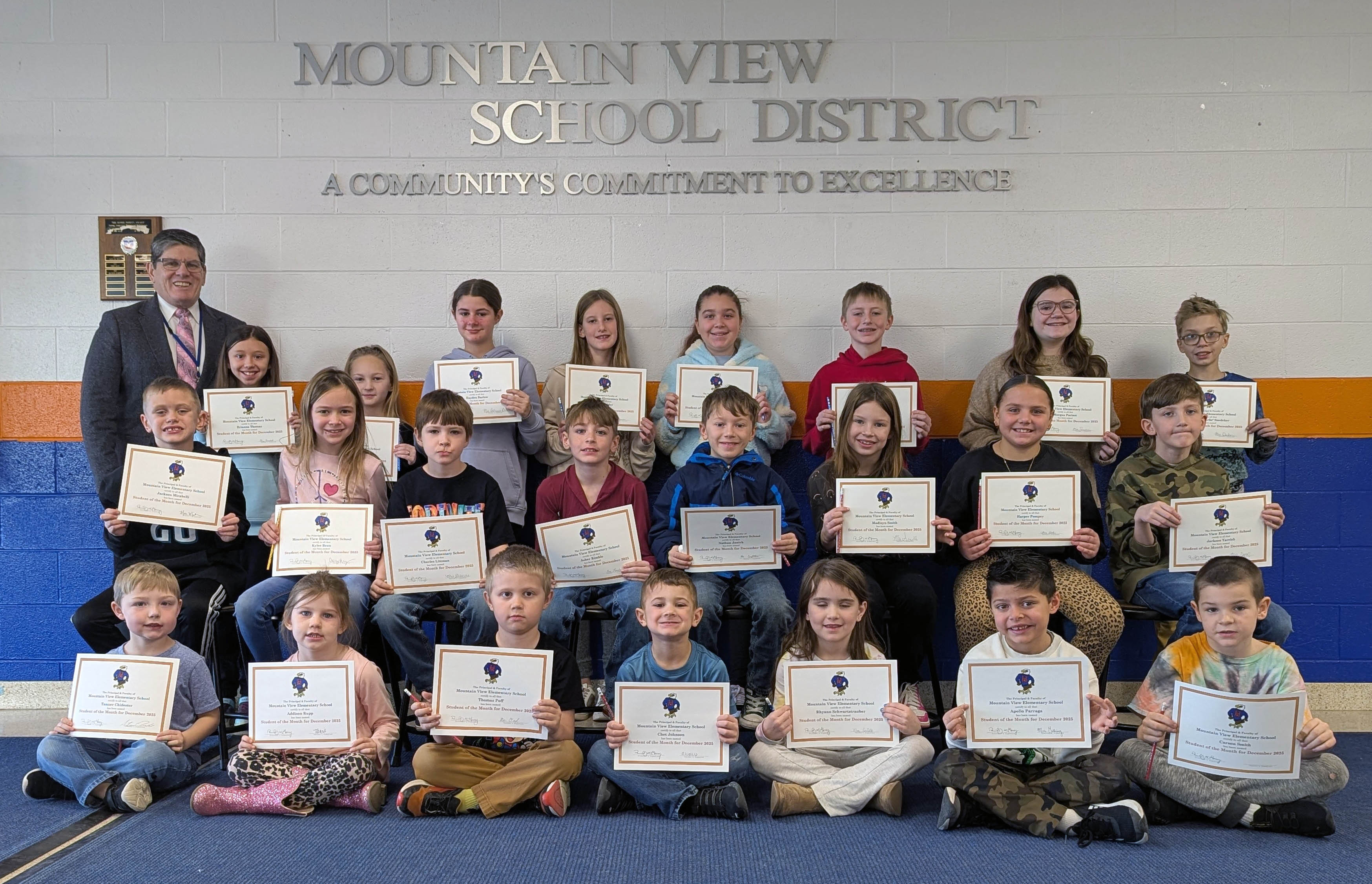 Pictured above (l-r) are Mountain View Elementary School's December, 2025 Students of the Month: first row - Tanner Chidester, Addison Rupp, Thomas Poff, Chet Johnson, Rhyann Schwartztrauber, Apollo Parraga, Carson Smith; second row - Jackson Mirabelli, Kylee Bean, Charlie Littman, Asher Kimble, Nathan Janick, Madisyn Smith, Harper Pompey, Jack Yarrish; third row - Principal Patrick McGarry, Brianna Thomas, Amelia Stoddard, Hayden Barlow, Riley Snyder, Sophia Mason,, Jake Molenko, Morgan Parisot, Charlie Snedeker. Not pictured: Diana Walters, Riley Ball.