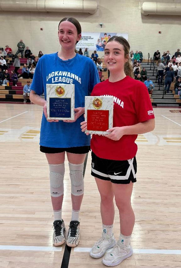 Addison Kilmer from Mountain View (left) and Amanda Dempsey from Dunmore were Most Valuable Players of their teams in the girls’ LIAA Senor All-Star Basketball Game. (Tom Robinson Photo)